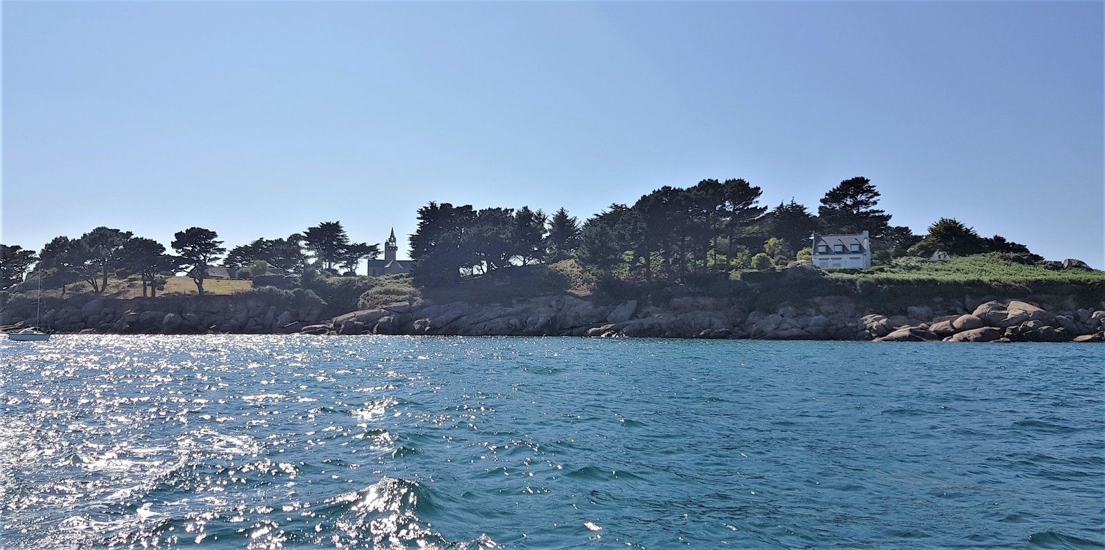 Lancés dans la baie à 18 nœuds soit environ 33 km/h nous arrivons rapidement au nord de l’île Callot. Gwendal fait rêver les petits et grands en nous racontant des histoires de corsaires et de vikings. Saviez-vous qu’un trésor serait caché sous la chapelle Notre Dame de Callot ?