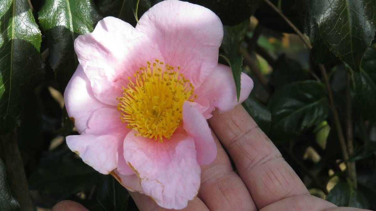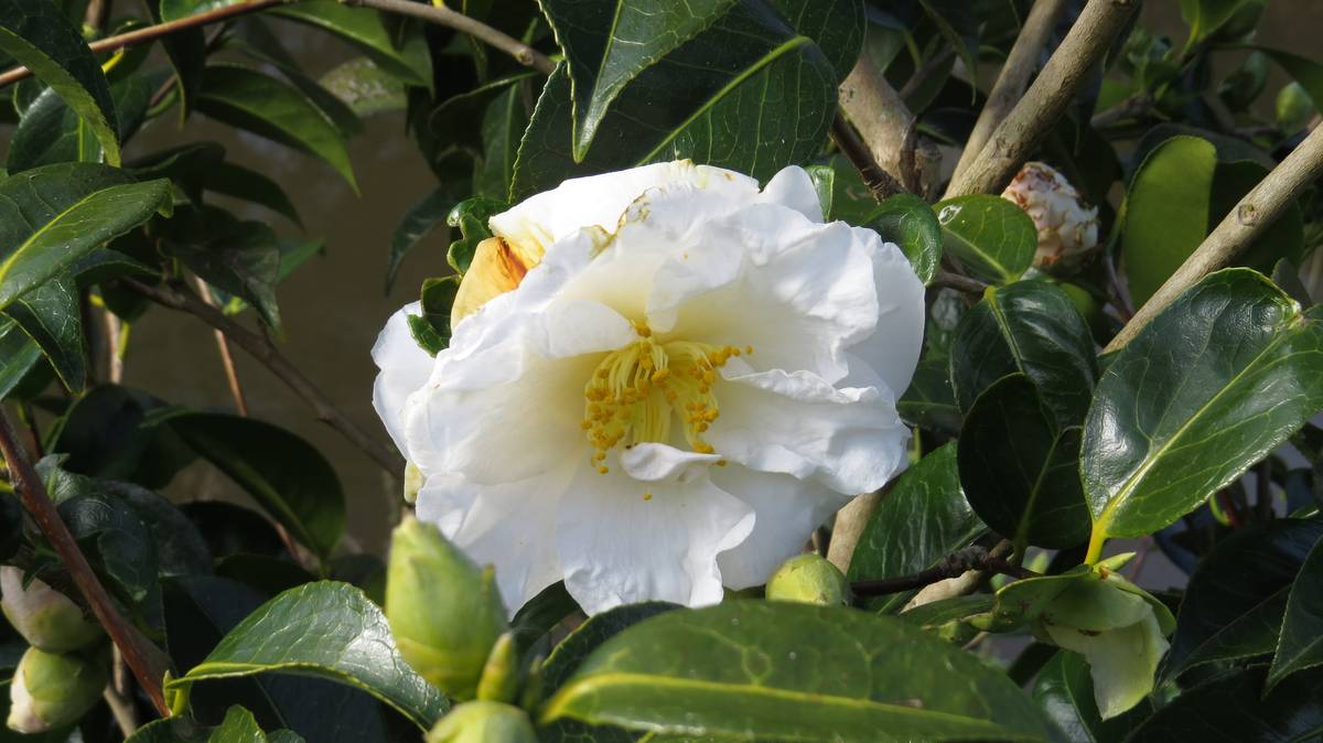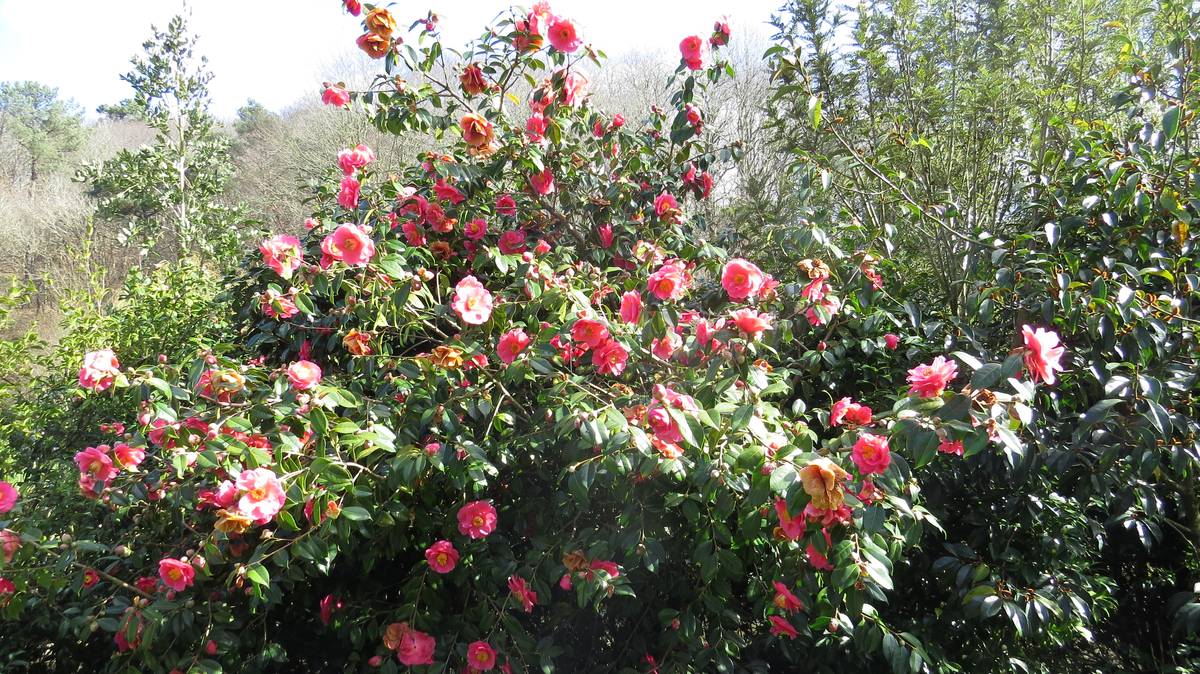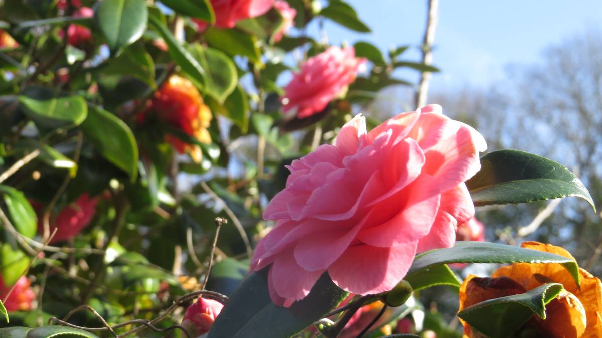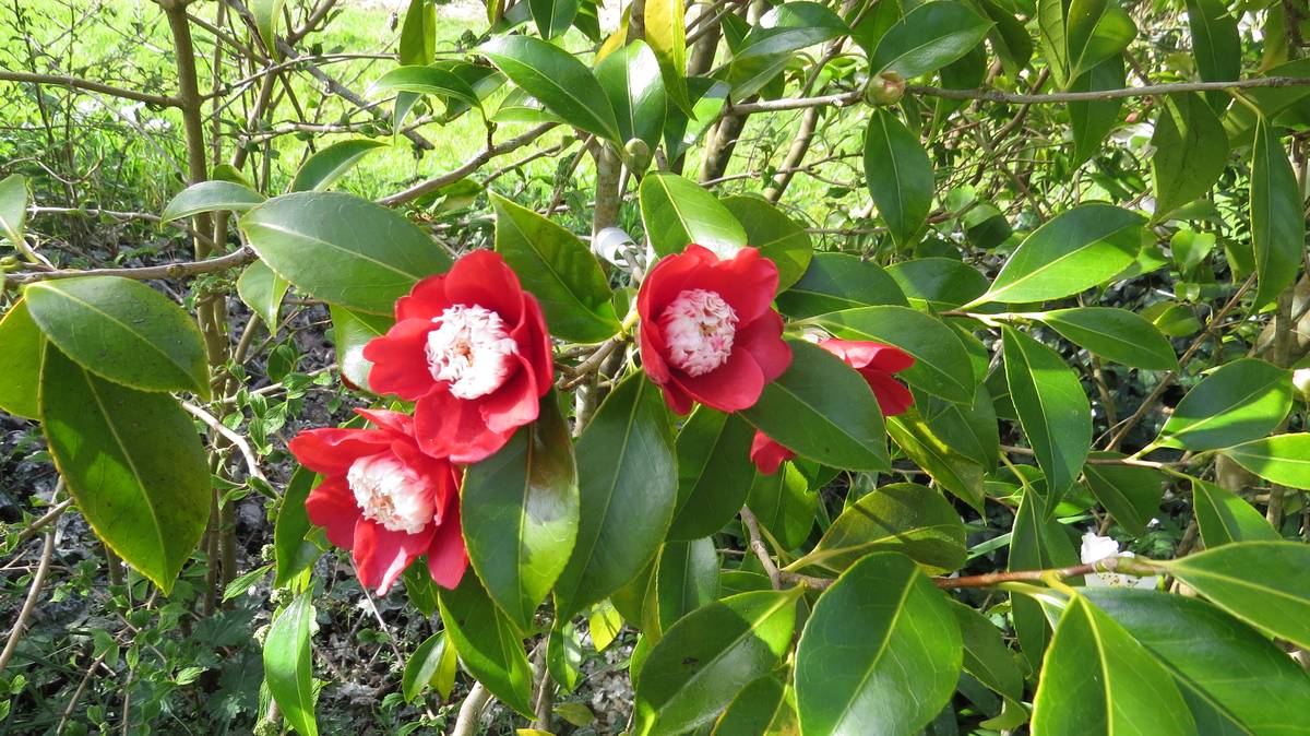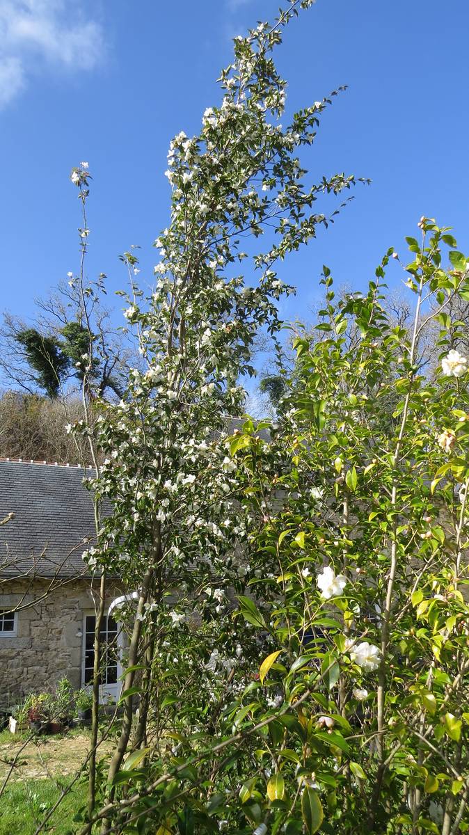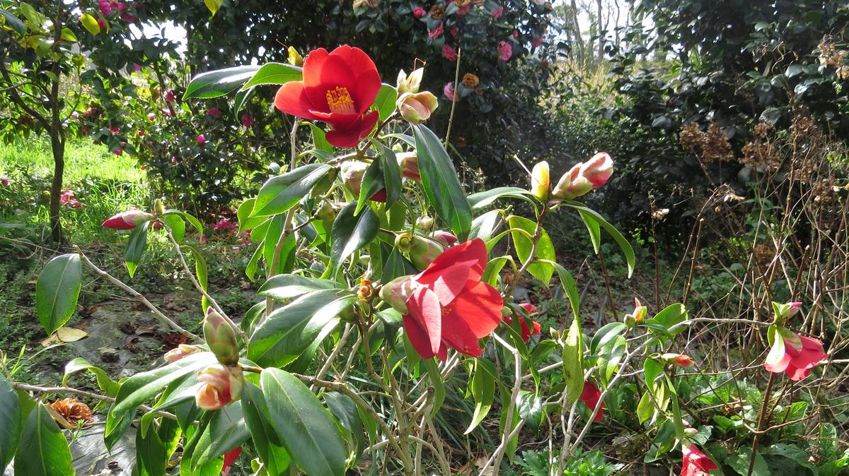 Près de 600 camélias poussent autour du Guillec. Outre, par exemple, les collections qui viennent du Portugal, certaines variétés se distinguent : le camélia de Brocéliande à la fleur un peu tubulaire, ouverte, avec les étamines d’un jaune profond ; le camélia Transnokoensis, botanique rarement si haut, à floraison rapide et faisant le bonheur des compositions florales. Parmi ces Theaceae, mon coup de coeur est un camélia à la qualité exceptionnelle… des couleurs profondes, une larme de rouge à l’intérieur des étamines… Quelle splendeur !