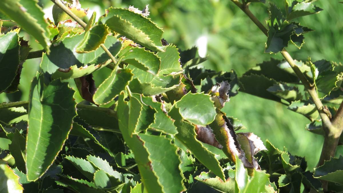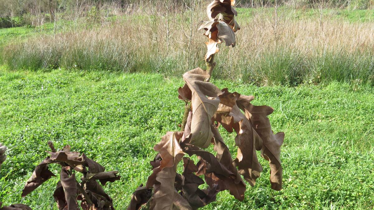 Autour de ces arbustes vivent paisiblement des arbres aux particularités uniques. Le chêne de l’Archipel des Kouriles conserve ses feuilles (50/60 cm). Ces dernières tombent uniquement à l’apparition des bourgeons. Son cousin, juste à côté, un chêne également, porte des feuilles démarrant comme des aiguilles de pin. Plus loin, l’hamamélis ou noisetier des sorcières et le noisetier du chili sont deux arbres fruitiers totalement différents du noisetier habituellement rencontré. Le premier, résistant à moins 25°C, originaire des contreforts de l’Himalaya chinois, fleurit l’hiver. Le second, du Chili, habitué à des températures atteignant les 40°C, forme des feuilles persistantes édentées. Deux espèces de la même famille… Aucune ressemblance !