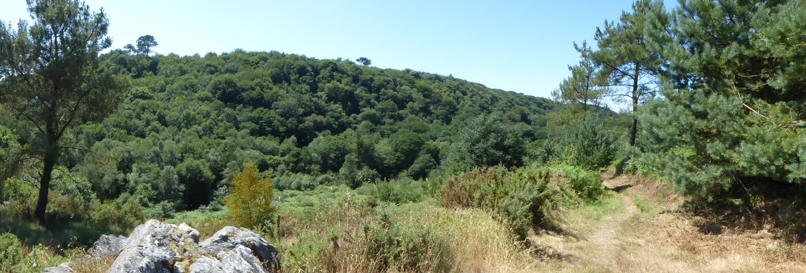 Je traverse un bois, je reviens sur le versant Sud de la vallée. Différentes essences de feuillus et quelques résineux m’entourent parmi lesquels houx, fougères, chênes, sorbiers avec ses fruits rouges, des ronces (dont les mûres seront bientôt picorées). La sortie de la vallée pointe son nez et sonne la fin de la randonnée.