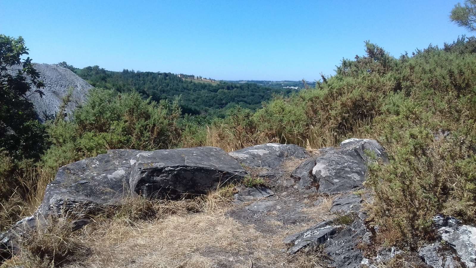 Je redescends, continue mon chemin et, aux ruines de Milin Coz, le versant abrupt me fait prendre de la hauteur. L’ascension effectuée, je m’assoie sur un rocher et admire respectueusement le calme et la beauté. Le tableau grandeur nature révèle les lieux, la carrière à l’ouest et à l’est le clocher. Je me pose toujours quelques minutes à cet endroit extraordinaire.
