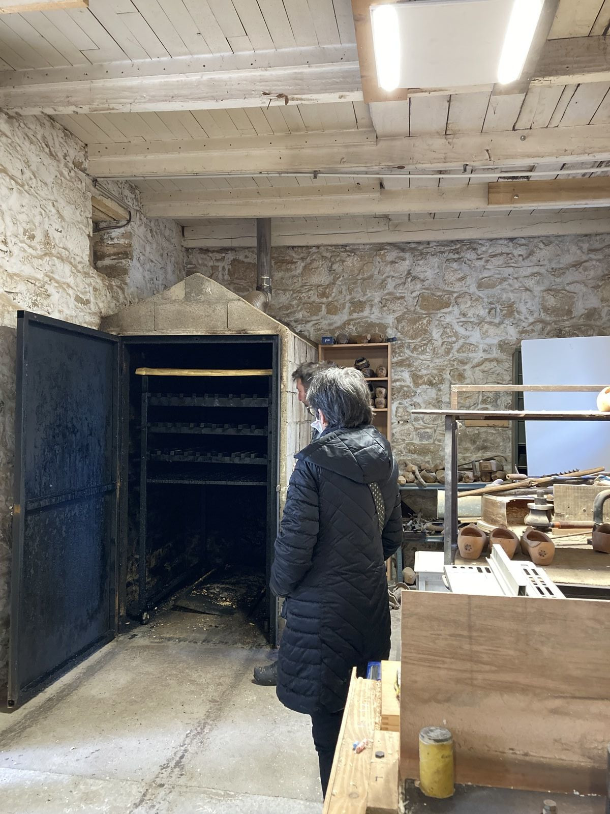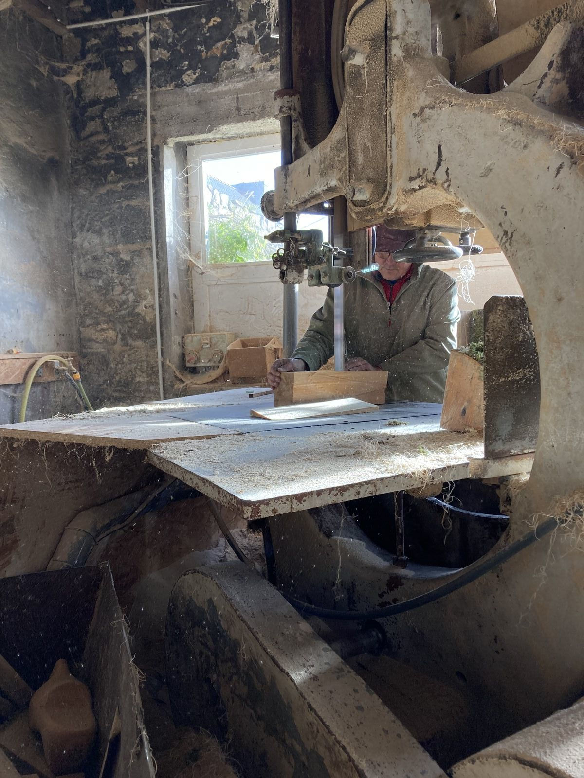 Nous les suivons ensuite sur les différentes étapes de fabrication, dans l’atelier. La visite est en fait une démonstration complète de fabrication d’une paire de sabot, à partir d’un billot de bois.