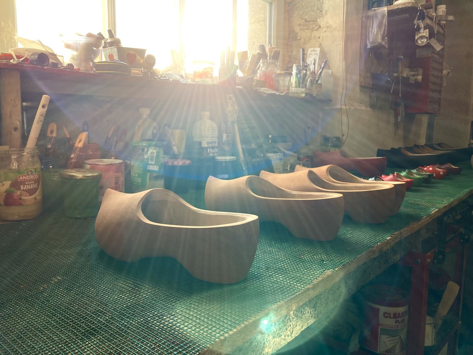 Après ce façonnage viendra la mise en peinture, l'application de la "griffe" du sabotier, le cloutage de la semelle et la couture des cuirs et renforts dont la démonstration nous sera faite sur une paire de sabot déjà sèche. Car avant d'arriver à ces dernières étapes, les sabots fabriqués devant nous seront entreposés dans une pièce à température constante, pour un séchage complet. C'est la seule partie du processus de fabrication à laquelle nous n'assisterons pas, et pour cause : il faut compter au total 6 mois de séchage avant que la paire de sabot se retrouve sur l’étale de la boutique.