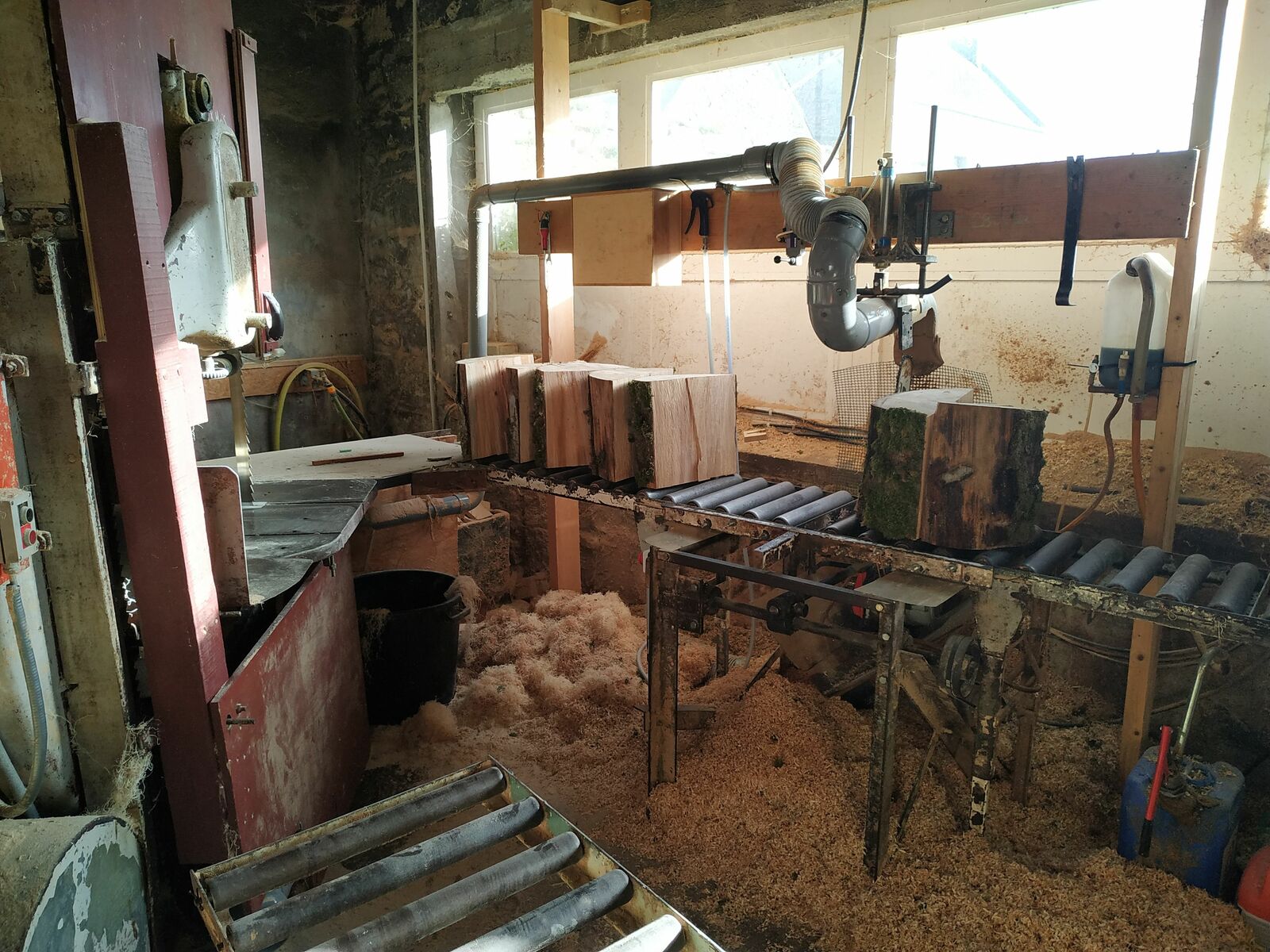 Cette visite d'entreprise, menée par nos deux artisans sabotiers, commence par la présentation de l’essence de bois utilisée pour la fabrication du sabot (du hêtre) et celles à ne pas surtout pas utiliser ;-) Dans la zone de stockage de la matière première : de grandes grumes à débiter au fur et à mesure des commandes.