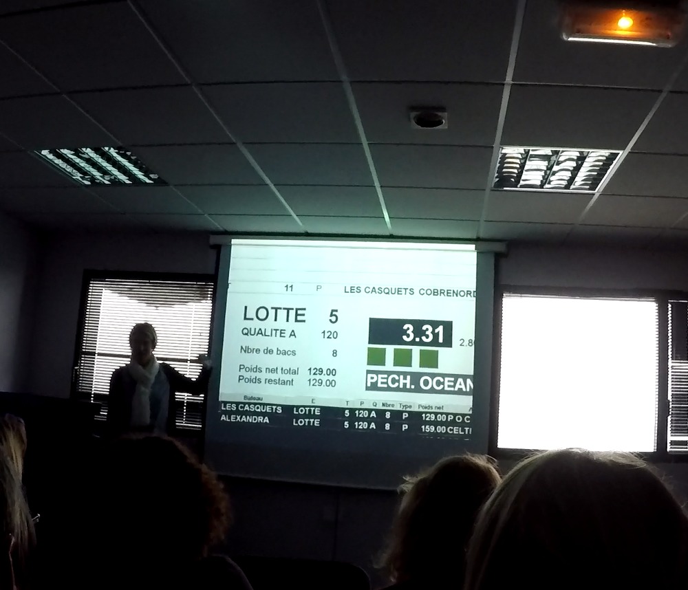 Notre guide nous explique, de façon ludique et à l'aide de vidéos, comment se déroulait une vente à la voix : à l’époque (jusqu'en 2005 pour la criée de Roscoff), un crieur annonçait oralement les prix aux mareyeurs et menait les enchères... Aujourd’hui c’est différent : la vente se déroule dans une salle informatisée où les mareyeurs se retrouvent pour acquérir le poisson.